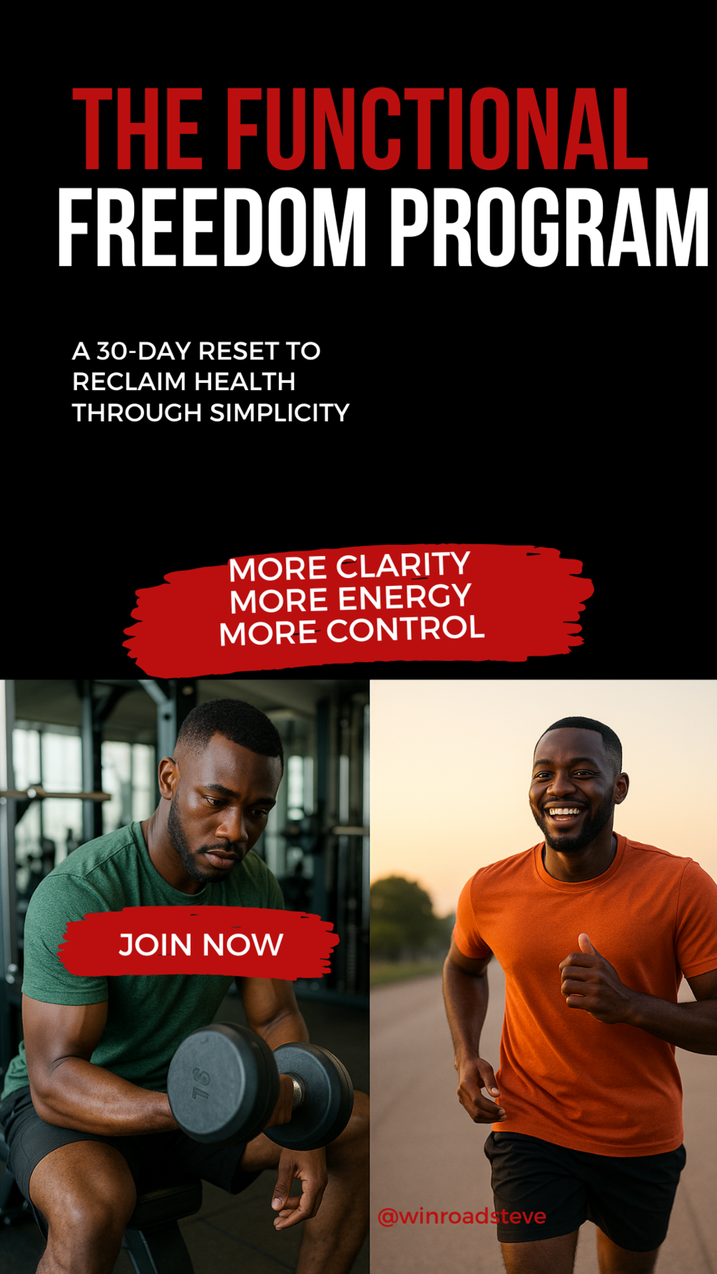 The Functional Freedom Program is a 30-day reset designed to help you reclaim your health, clarity, and strength—not through hacks, fads, or overcomplication, but through radical simplicity.
